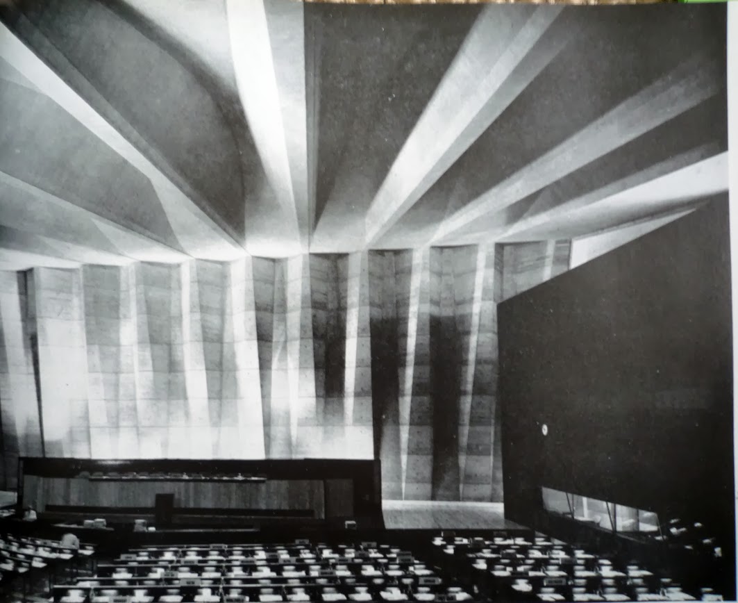 Architecture d'Aujourd'hui en 1958 fit un article complet et même sa couverture avec le même motif que Pablo Volta mais dans un traitement encore plus abstrait. Comme ce dossier comporte... 32 pages (!), je ne vous montrerai que quelques photographies de la Salle des Conférences (ou salle des séances plénières)... Mais ce qu'il faut surtout faire c'est visiter cette construction et ses jardins lors de votre prochain passage à Paris.